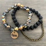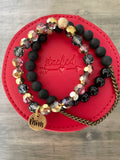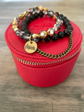 The Mother's Day gift set comes with the half stack and matching travel case pictured. Made with gemstones, crystals and our STACKED exclusive two-sided "Mom" charm.