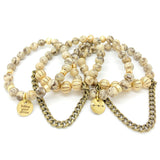 Comes with two single bracelets. One w/our STACKED exclusive two-sided "follow your arrow" charm w/arrow graphic on the back. The second bracelet has gold filled accents and loop chain detail.