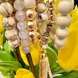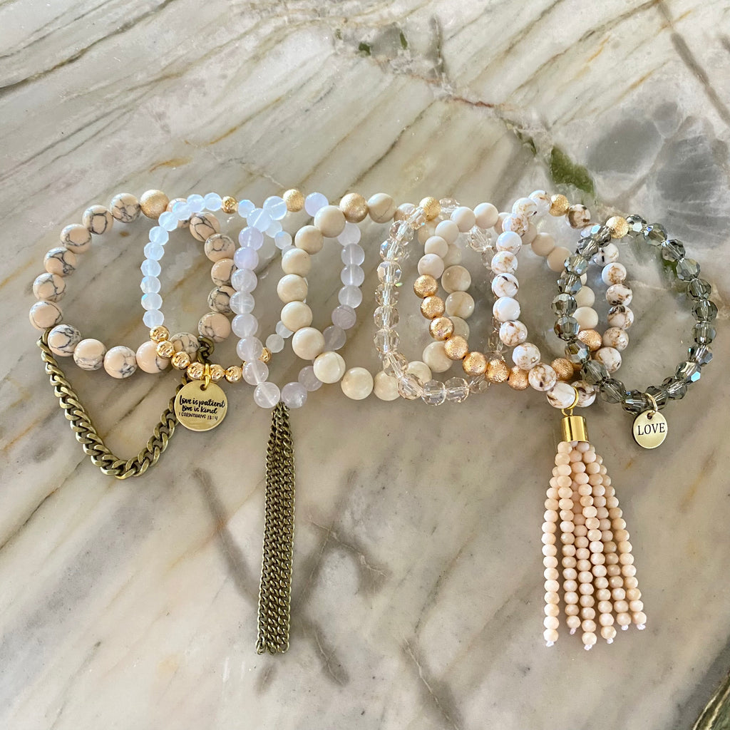 The 1 Corinthians 13 stack comes with the 8 singles pictured. Made with 6, 8 and 10mm gemstones and crystals with a nude tassel, chain detail and gold filled accents. Includes our STACKED exclusive two-sided "LOVE" and 1 Corinthians 13 charms.