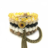 Comes with our custom two sided sunflower charm and the five singles pictured. Made with Swarovski crystals, jade, jasper and gemstones.