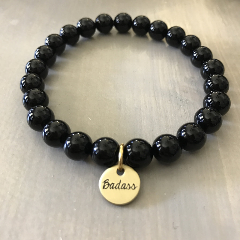 This single comes with our custom antique bronze "Badass" charm. Made with black agate.