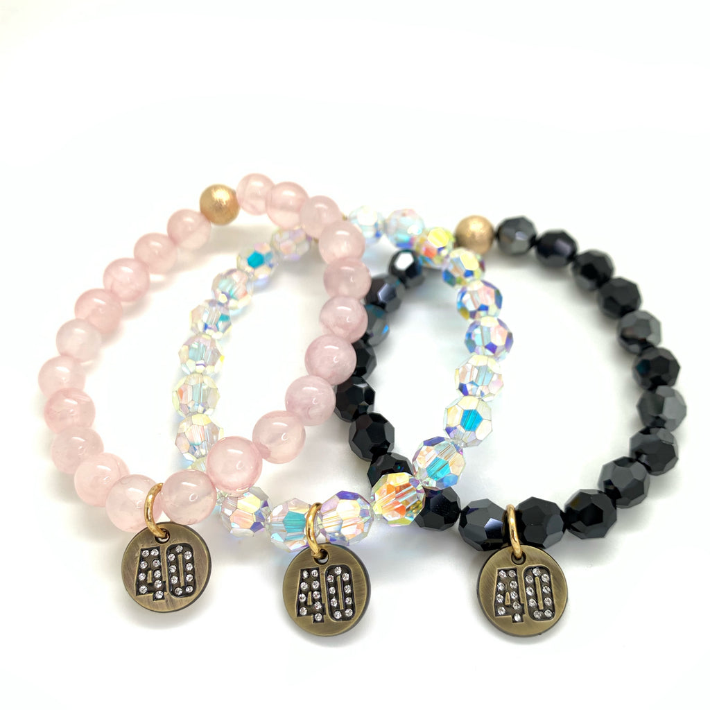 Choose between the three singles pictured with our STACKED exclusive "40" charm in rhinestones. Made with quartz or Swarovski crystals.