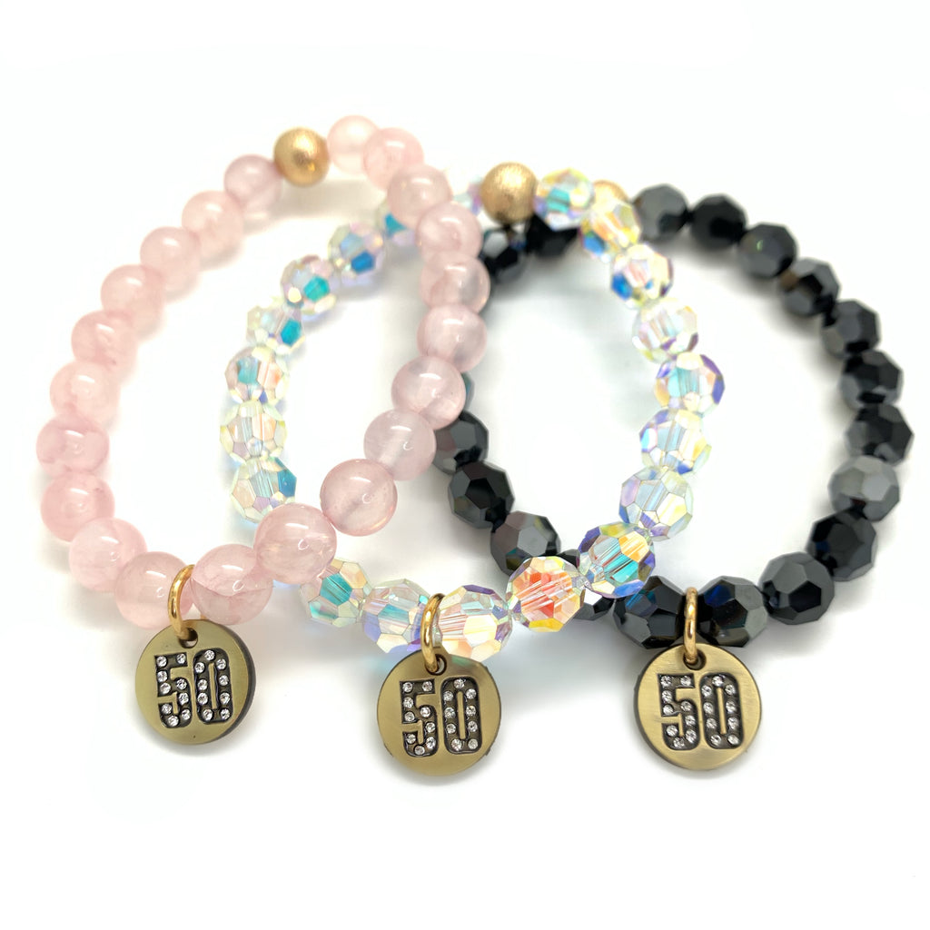 Choose between the three singles pictured with our STACKED exclusive "50" charm in rhinestones. Made with quartz or Swarovski crystals.