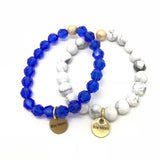 Choose between blue Swarovski Crystals or white howlite with our custom two sided “Boy Mom” charm.