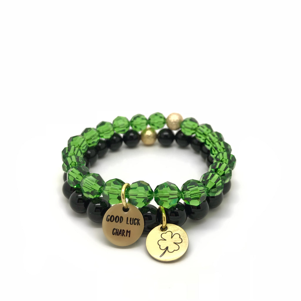Choose between green Swarovski Crystals or black gemstones with our custom two sided charm. Front says “Good Luck Charm” with a four leaf clover on the back.