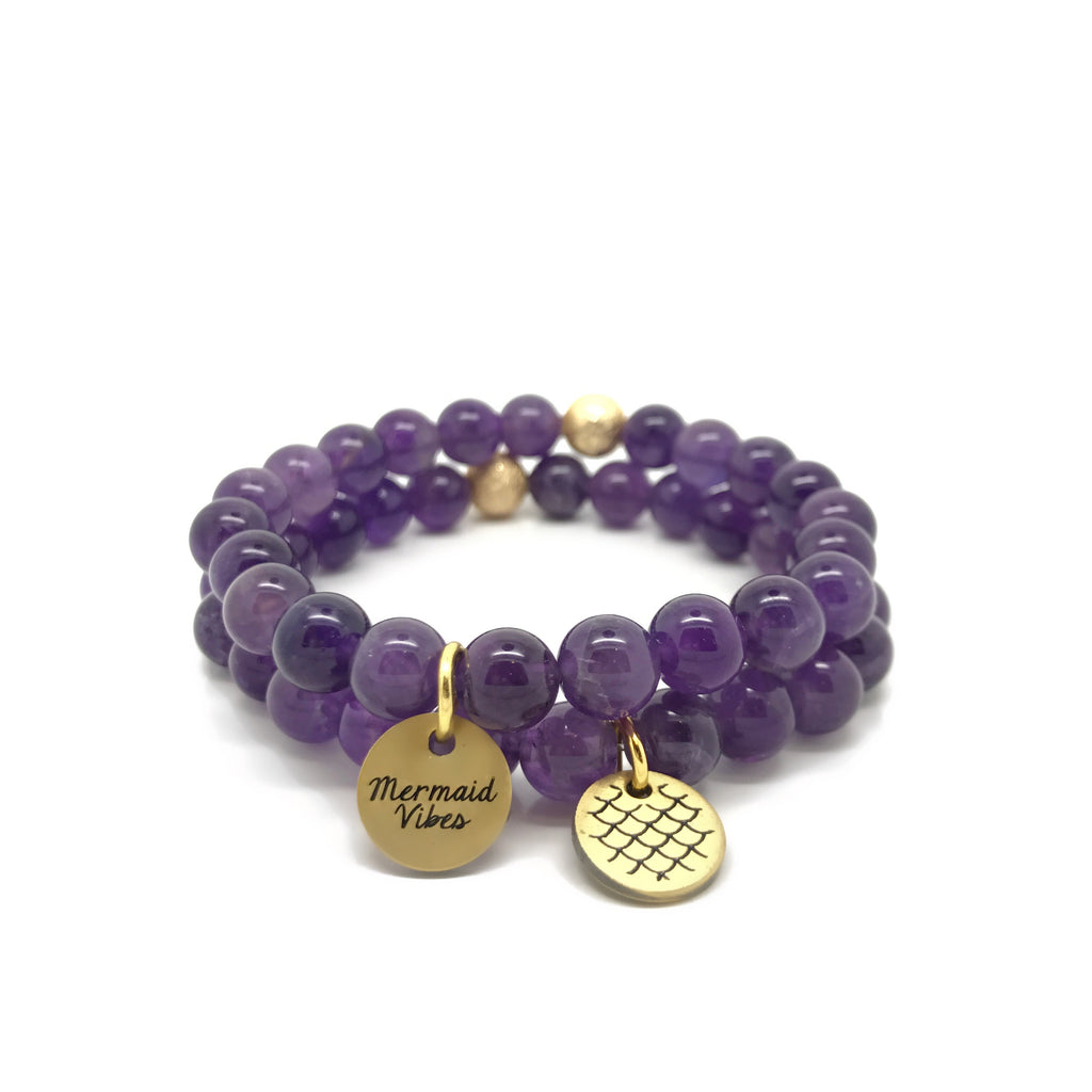 This single comes with our custom two sided charm with "MERMAID VIBES" on the front and mermaid scales on the back. Made with amethyst.
