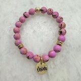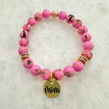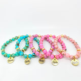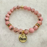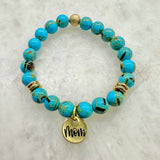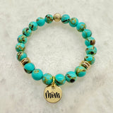 Choose between the five singles pictured with our STACKED exclusive two sided Mom charm. Made with 8mm gemstones and gold filled accents.
