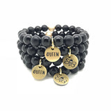 Made with alternating shiny and matte gemstones and custom two sided charm that says "QUEEN" on the front with a bee graphic on the back.