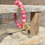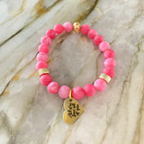 Made with matte melon colored gemstones, gold filled accents and our STACKED exclusive two sided "All of me loves all of you" heart shaped charm.