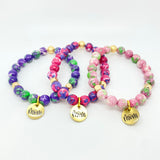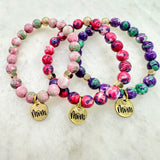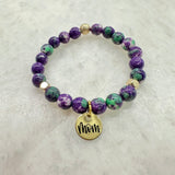 Choose between the 3 colors pictured. Made with 8mm gemstones and gold filled accents with our STACKED exclusive two sided Mom charm.
