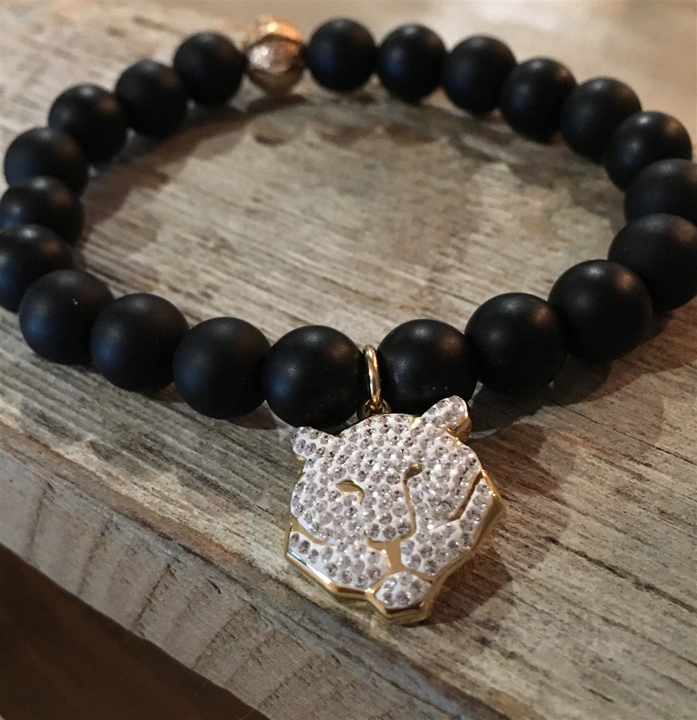 Single matte black agate bracelet with a Swarovski crystal Tiger and 14k gold filled spacer.