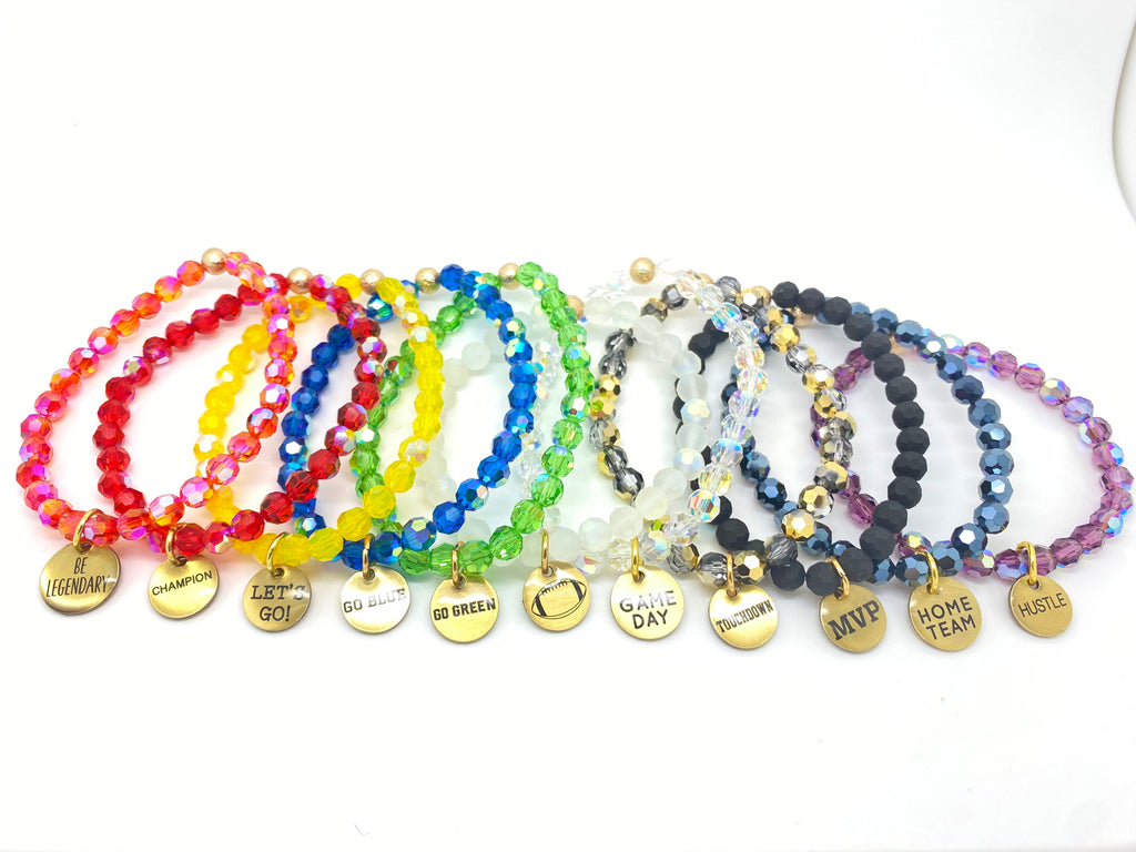 Sold as a single bracelet. Made with 6mm crystals and our custom two sided STACKED exclusive charm.