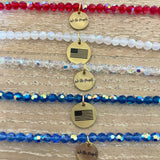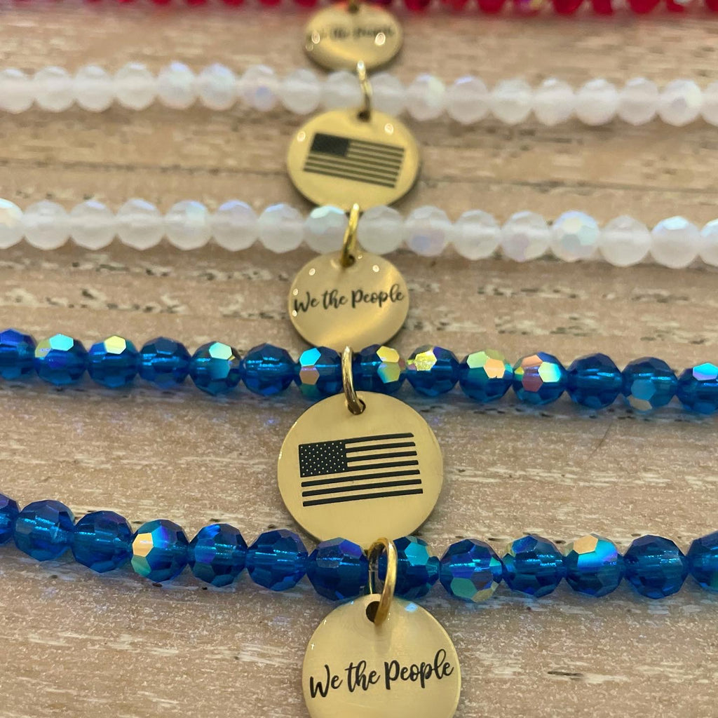 Sold as a single bracelet. Choose between our STACKED exclusive two sided “We the People” or American flag charm. Made with 6mm crystals and golD filled accents.