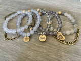 This stack comes with the five singles pictured with our STACKED exclusive two sided "Family First" "Mom" and "All of me loves all of you" charms. Made with gemstones and crystals with chain detail and gold filled accents.