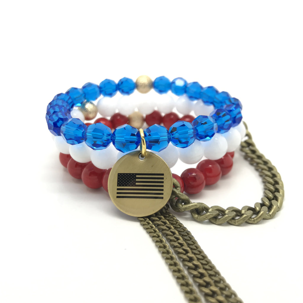 This red, white and blue stack comes with the three singles pictured with chain detail and our custom two sided American Flag charm. Flag has all 13 stripes and 50 stars on it!