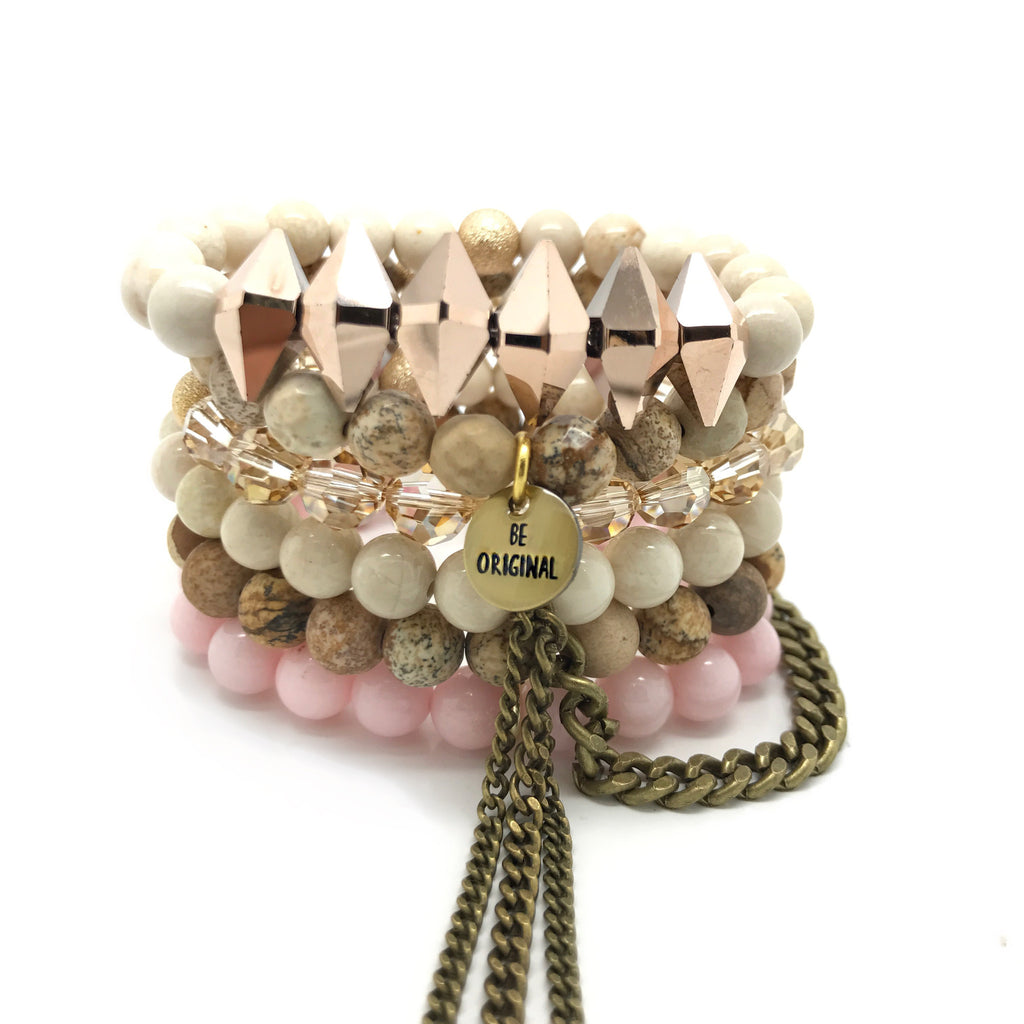 This stack comes with the 6 singles pictured with our custom two-sided "BE ORIGINAL" charm. Made with Swarovki Crystal, gemtones and chain detail.
