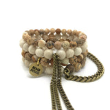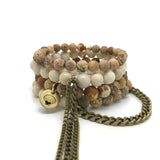 This stack comes with the four singles pictured with our custom two sided "BEACH PLEASE"/ seashell charm and chain detail. Made with 6 and 8mm jasper and gemstones.