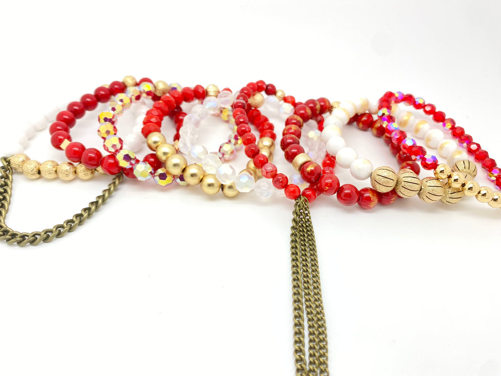 This stack comes with the 9 singles pictured. Made with gemstones, crystals, gold filled accents and chain detail. Any charm can be added.