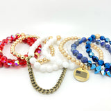 This stack comes with the eight singles pictured with our STACKED exclusive two sided American flag charm, chain detail and 14k gold filled accents. Made with 6 and 8mm gemstones and crystals.