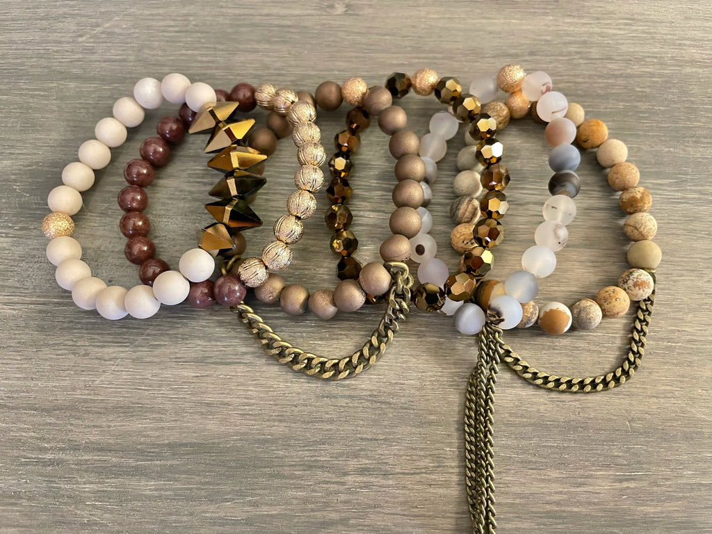 This stack comes with the six singles pictured. Made with 8mm gemstones, crystals and gold filled accents. To add a charm, please leave a note in the special instructions section at checkout.