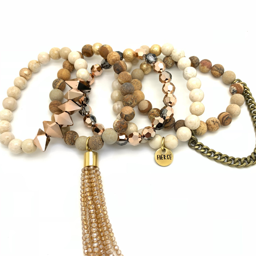 This stack comes with the five singles pictured with our STACKED exclusive two sided “FIERCE” charm, tassel, Swarovski spikes and chain detail.