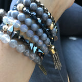This stack comes with the seven gray bracelets pictured. Made with 6 and 8mm Swarovski crystals, jade and quartz.