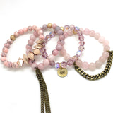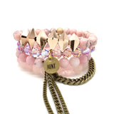 Choose between our STACKED exclusive two sided "AUNT" "GRANDMA" "MOM" or "SISTER" charm on the four bracelets pictured. Made with quartz, gemstones and crystals.