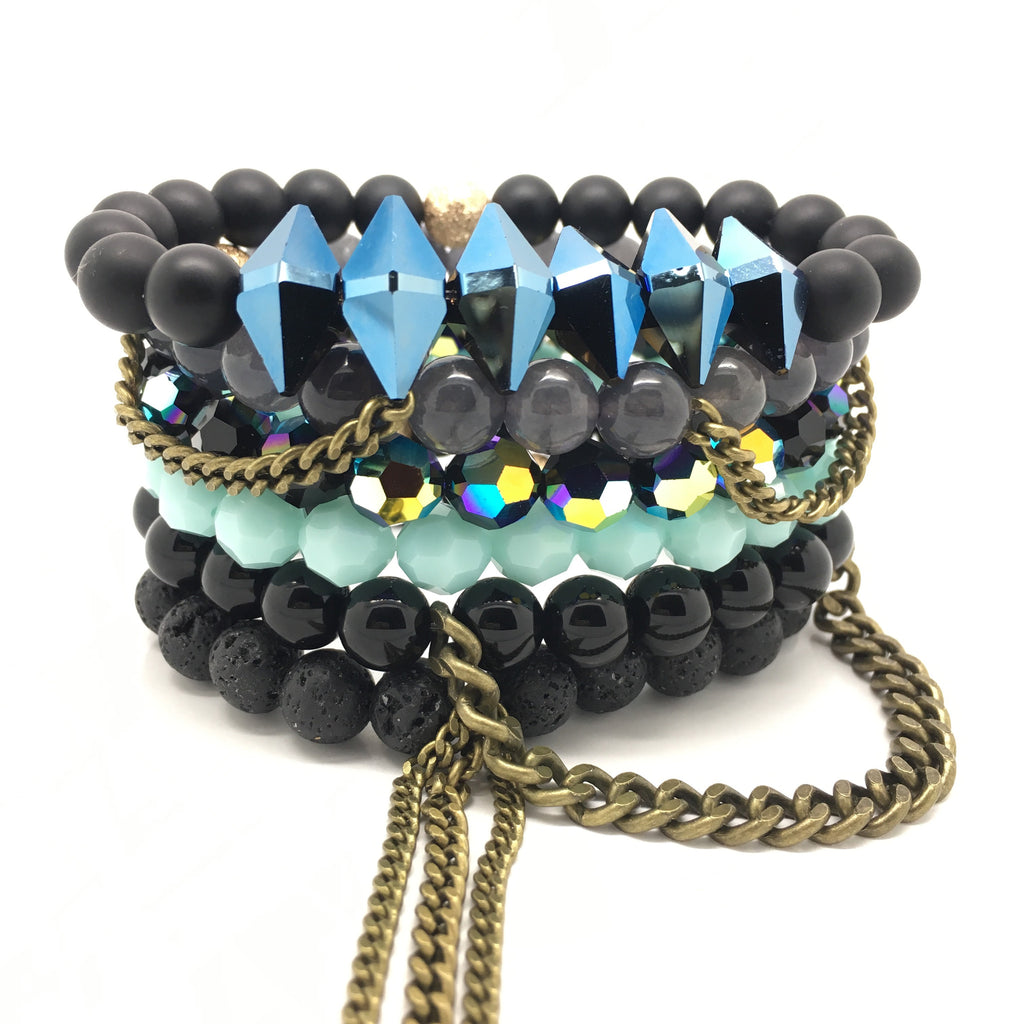 This stack comes with the six singles pictured with chain detail and 14k gold filled spacers. Made with agate, lava, jade and Swarovski crystals.