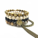 This stack comes with the four singles pictured with our custom two sided lie detector charm. Made with gemstones and Swarovski Crystals.