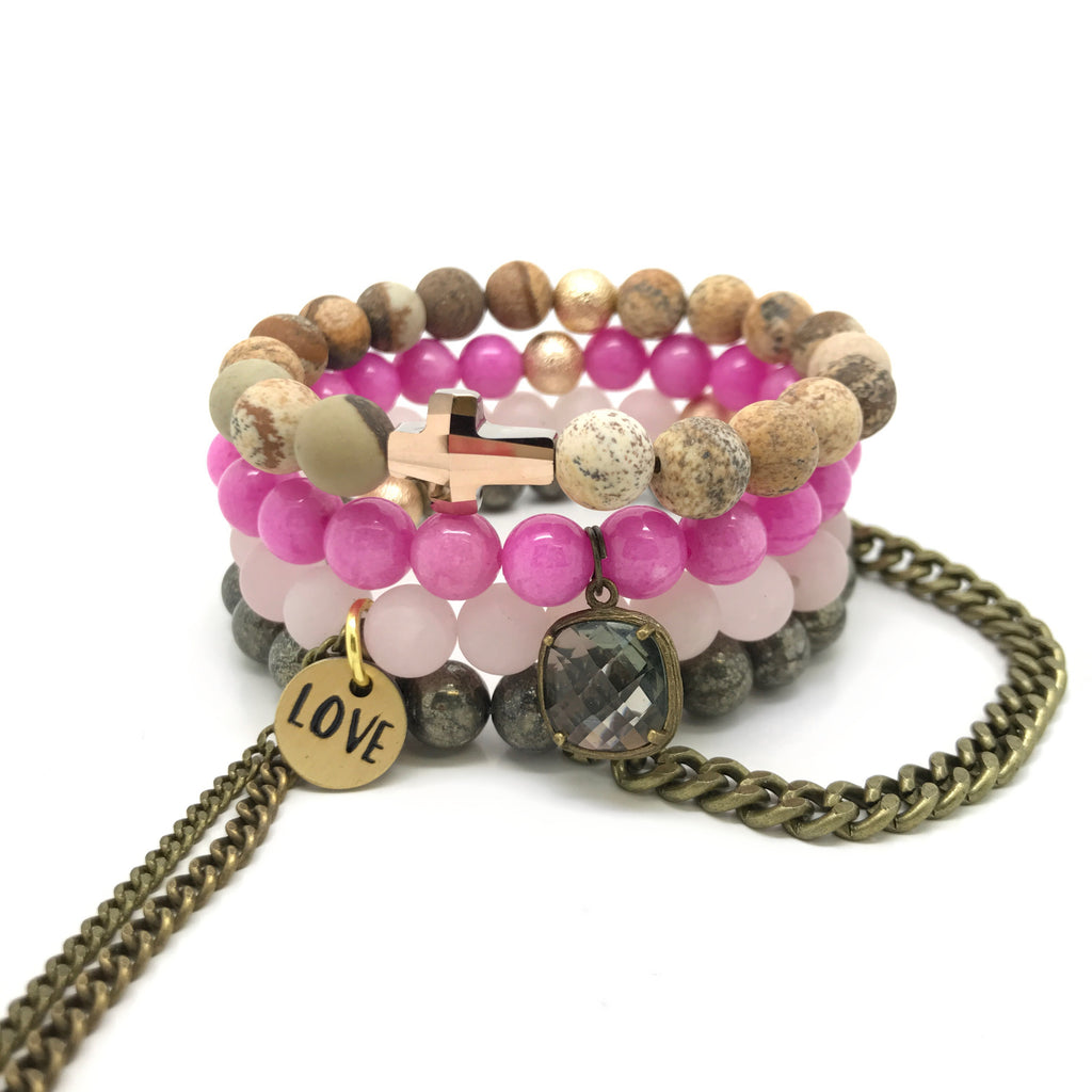 This stack contains the four singles pictured. Made with quartz, jasper and pyrite.