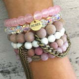 This stack comes with the six singles pictured with chain detail and our custom two sided "REBEL" charm. Made with quartz, jade, turquoise and Swarovski crystals.