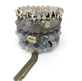 This stack comes with the six singles pictured with our custom two sided "iNSPiRE" charm. Made with jasper, quartz, jade and Swarovski crystals with chain detail.