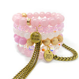This stack comes with the six singles pictured with our STACKED exclusive two sided "2021" and "THE BEST IS YET TO COME" charms. Made with 8 and 10mm gemstones and Swarovski crystals.