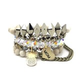 Comes with the 5 gold tone bracelets pictured. Made with Swarovski crystals and and gemstones. Comes with our custom two-sided "MOM" heart chart and pineapple charm too.