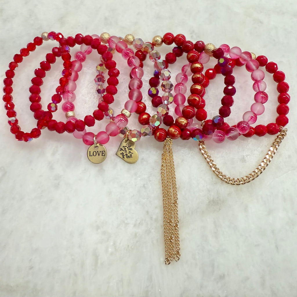 1 of 1 limited Valentine’s Day red stack. Comes with the 8 singles pictured with gold filled chains and accents. Stack is 7”. Please leave a note in the special instructions at checkout or email contact@shopstacked.com if a different size is needed.
